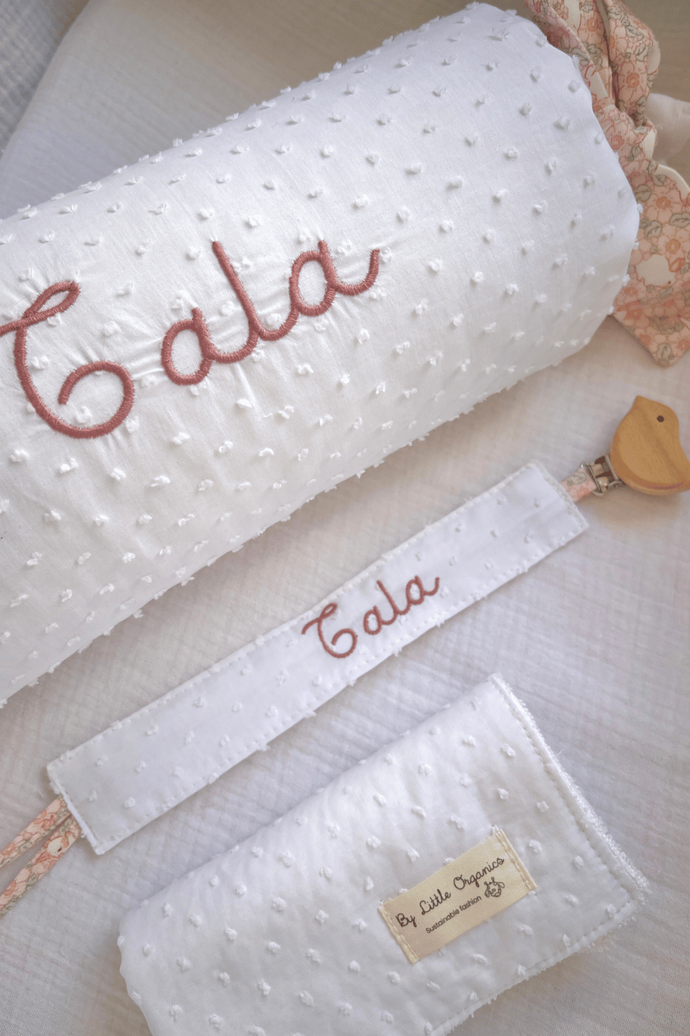 Este pack contiene Cojín antivuelco, chupetero y mini toalla. Ideal para regalar a un recién nacido.